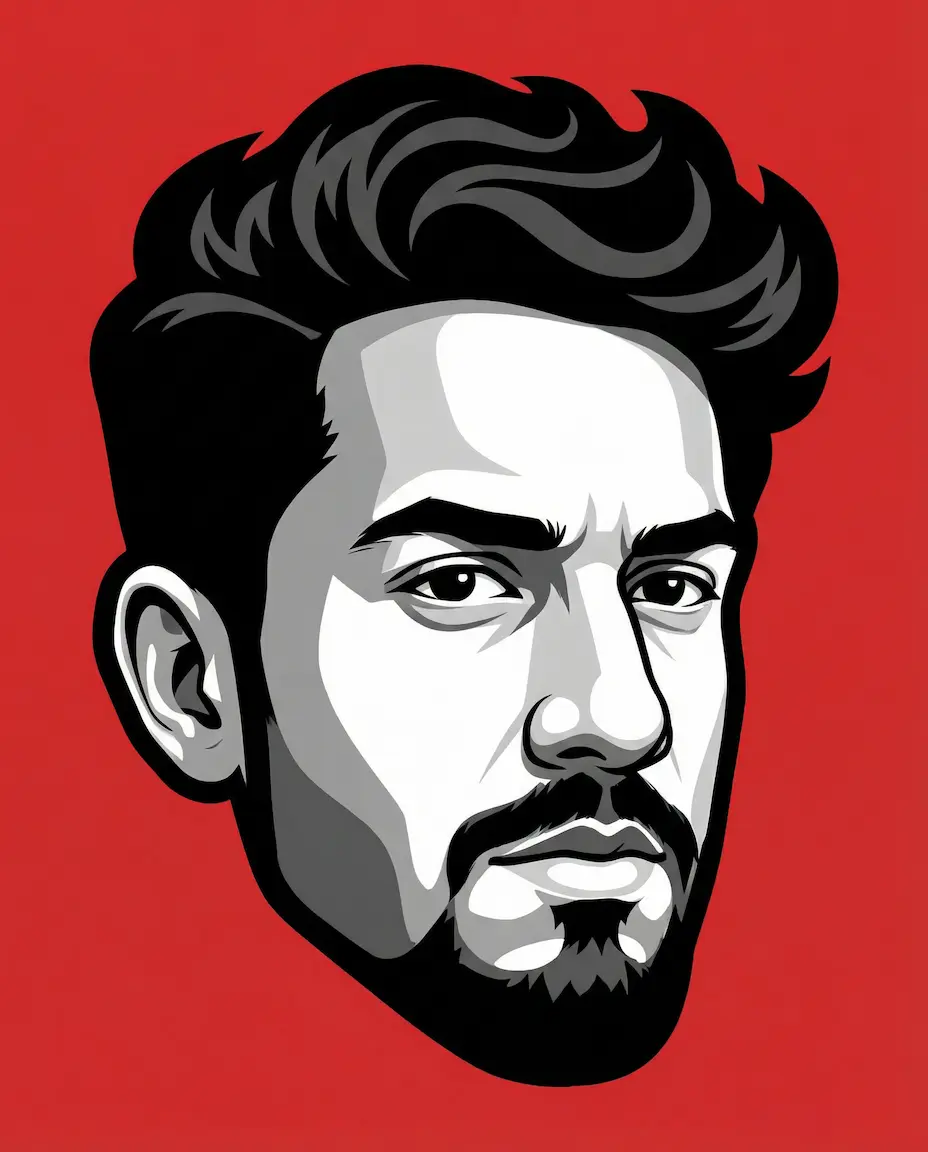 • Create this photo without altering the face in the slightest. This portrait depicts a young man with thick black hair combed up and slightly back, a thin mustache, and a vertical collage composition divided into five parallel panels from left to right, each showing a different expression and lighting. The shooting range is from close-up to headshot (approximately 60–80 cm from the subject), using an 85mm portrait lens with an f/2.8 aperture to produce sharp facial details against a soft background and shallow depth of field. High resolution, realistic skin texture, natural-looking pores, without over-exaggeration. First panel: left side view with a neutral and serious expression, soft lighting from the front left, natural tones against a subtle light gray background. Second panel: left three-quarter angle, focused and contemplative expression, cool greenish lighting, soft teal gradient background. Third panel: front view, calm yet intense expression, balanced lighting from the front (large softbox), natural skin tones, neutral gray background. Fourth panel: Front view with very low-key lighting, the side of the face largely in dark shadow, high contrast, pitch-black background. Fifth panel: Right side view with a screaming, wide-open mouth, dramatic red lighting from the right side (red gel light), dark red background, angry and intense tone. The overall lighting is professional studio style with firm shadow control in each panel. The transitions between panels are clean and precise, creating a modern, symmetrical composition. The emotional atmosphere evolves from calm, reflective, mysterious, to explosive. Cinematic, dramatic, high-contrast, sharp yet realistic colors, very clear facial details, high-quality editorial portrait photography, photorealistic, cinematic lighting, ultra-detailed skin texture, sharp focus, 8K resolution.