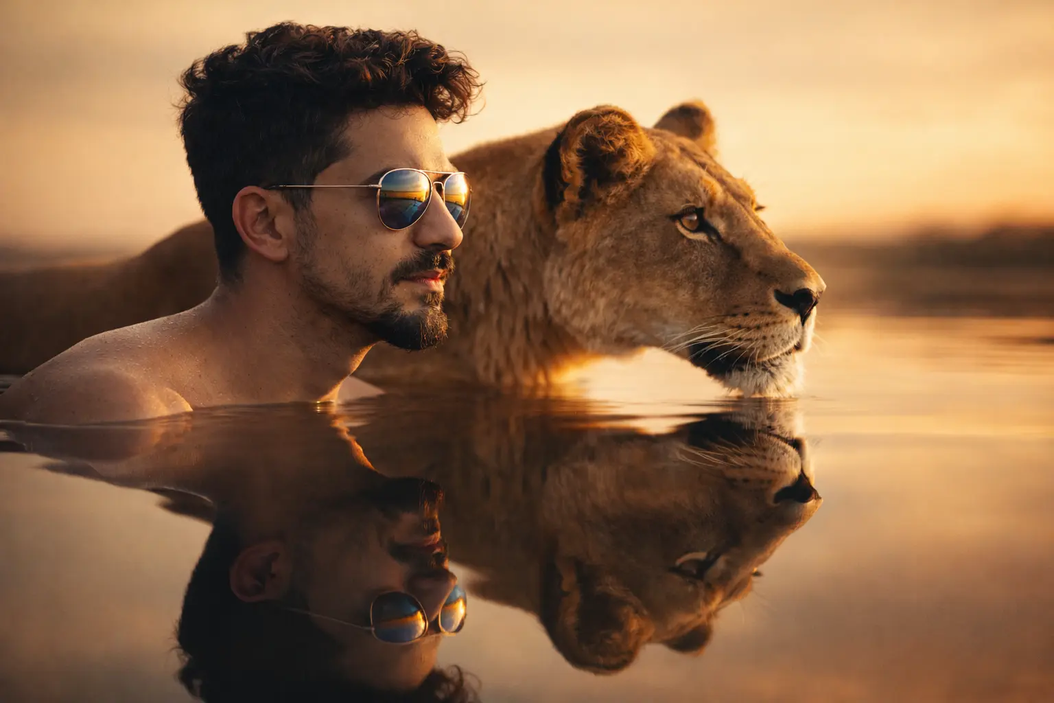 • Cinematic portrait of a man with wet black hair and intense gaze standing chest-deep in water beside an adult leopard, both facing camera in heavy rain with visible raindrops, dark bokeh background, and warm golden water reflections.